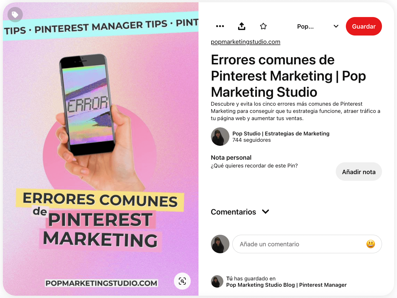 → Comparte 10 pines por cada artículo. Para ello te recomiendo crear, antes de empezar, 10 diseños de pines modernos y adaptables con una tipografía legible para los títulos y que incluyan el nombre de tu página web o marca. Puedes crear este grupo de diseños donde te resulten más rápidos de personalizar pero, por ejemplo, si decides utilizar Canva para ello, te recomiendo que crees desde cero los diseños en vez de utilizar creaciones gratuitas y disponibles ya que la mayoría han sido utilizadas por alguna marca en la plataforma y Pinterest puede clasificar tus pines como contenido duplicado.